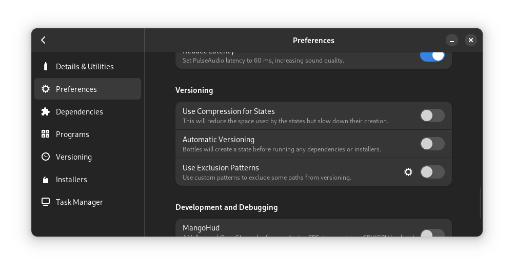 The new system arrives with several options, all configurable from the Bottles user interface. Now the versioning system is on by default for all bottles but will not act automatically, you will in fact need to enable the option from the preferences, from which you can disable it at any time to pause it.