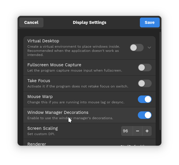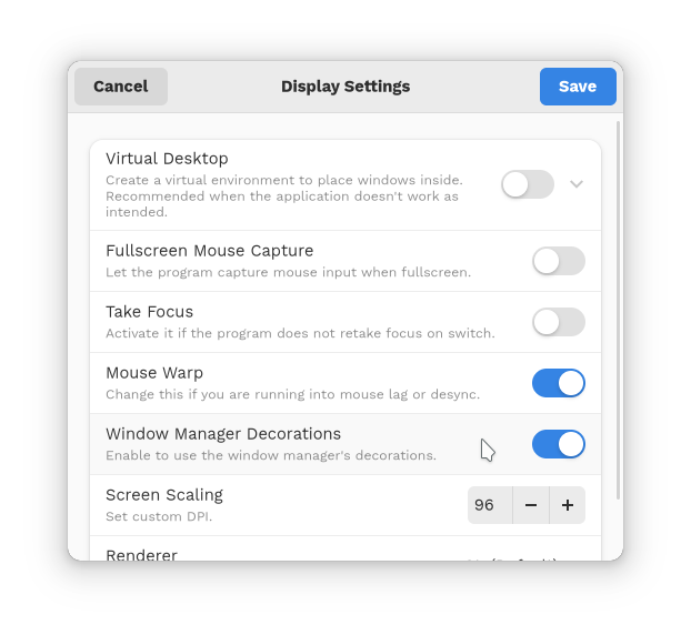 There’s now a new settings to disable window decorations in the Display Settings of each bottle. This fixes issue #2309 where the settings was only available in Wine config.